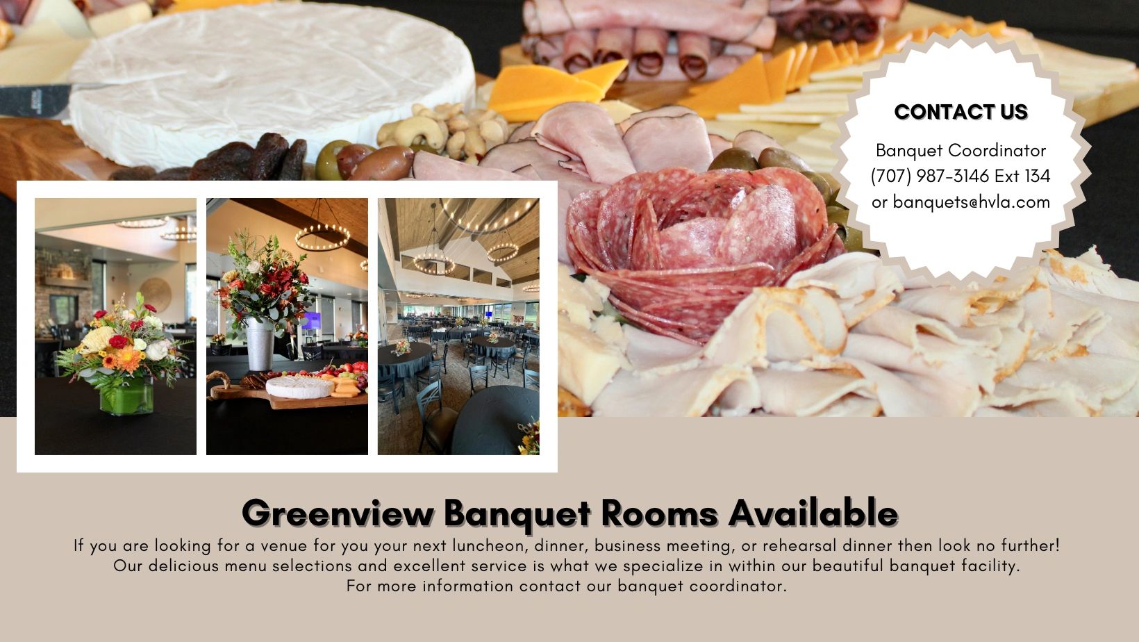 On behalf of the Greenview Banquet & Event Center, we welcome you to call us to reserve one or more of our beautiful banquet rooms for your upcoming event. Contact our Banquet Staff at (707) 987-3146 Ext. 134